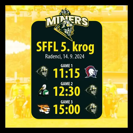 To soboto, 14. septembra, Črni rudarji odhajamo v Radence, kjer nas čaka 5. krog Slovenske Flag Football Lige in zadnje tri tekme rednega dela.