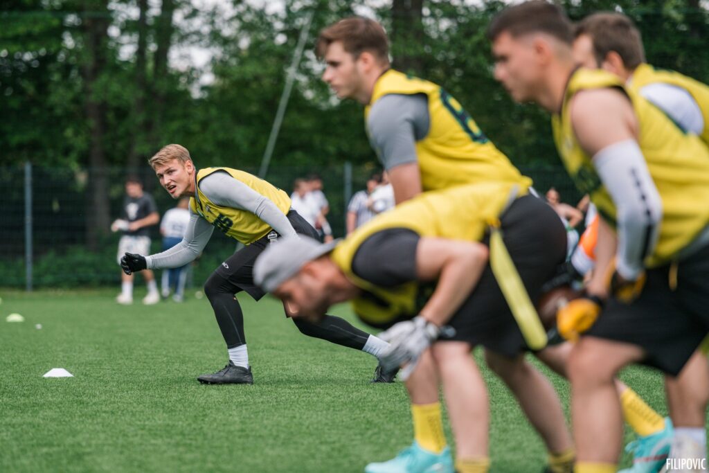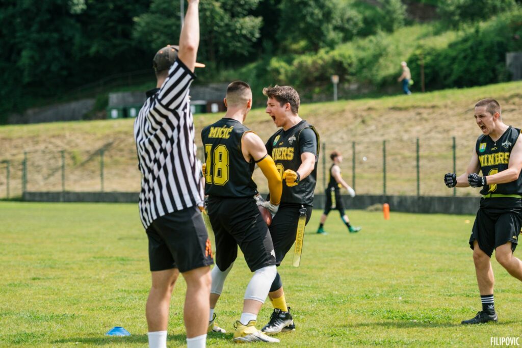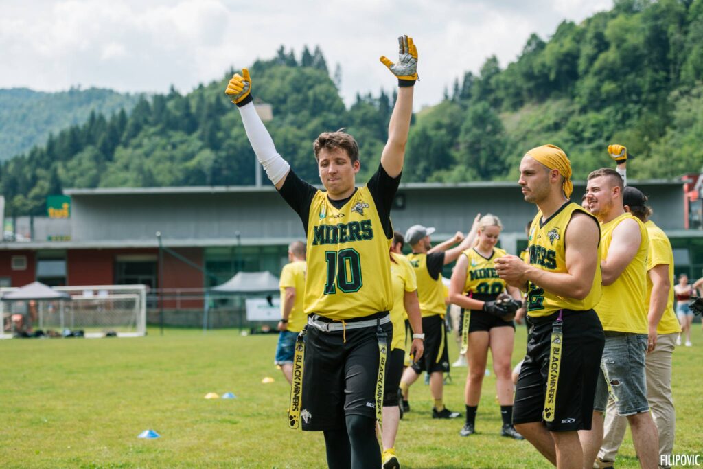 Tri zmage in ohranitev 2. mesta Črni rudarji smo tudi tokrat zasijali na igrišču! Iz Radencev se vračamo s popolnim izkupičkom treh zmag brez poraza, kar pomeni da smo 𝘂𝘀𝗽𝗲𝘀̌𝗻𝗼 𝘇𝗮𝗱𝗿𝘇̌𝗮𝗹𝗶 𝟮. 𝗺𝗲𝘀𝘁𝗼 𝗻𝗮 𝗱𝗿𝘇̌𝗮𝘃𝗻𝗶 𝗹𝗲𝘀𝘁𝘃𝗶𝗰𝗶! To drugo mesto nam prinaša ključno prednost v končnici, eno tekmo manj! Končnica se bo odigrala čez slaba dva tedna v Velenju, o tem pa izveste še več prav kmalu. Prvo tekmo proti Novo mesto Knights smo odigrali brez napak tako v napadu kot v obrambi ter slavili z rezultatom 39:19. Naša ekipa je pokazala brezhibno igro, napad je bil prava ofenzivna sila, touchdowne smo zadevali z vseh strani in iz vsake situacije! Obramba pa je nasprotnikom močno otežila doseganje točk. Drugo tekmo proti Murska Sobota Storks, na kateri smo nadaljevali z izjemno napadalno in obrambno igro, smo zaključili s prepričljivo zmago 62:12. Enaka zgodba se je ponovila tudi v tretji tekmi in tako je sledila še zmaga proti Domžale Tigers z rezultatom 47:24. Naši fantje so dobesedno prevladovali na igrišču, napad je bil strupeno nevaren v vsakem trenutku, obramba pa je zadrževala nasprotnike daleč stran od doseganja točk.